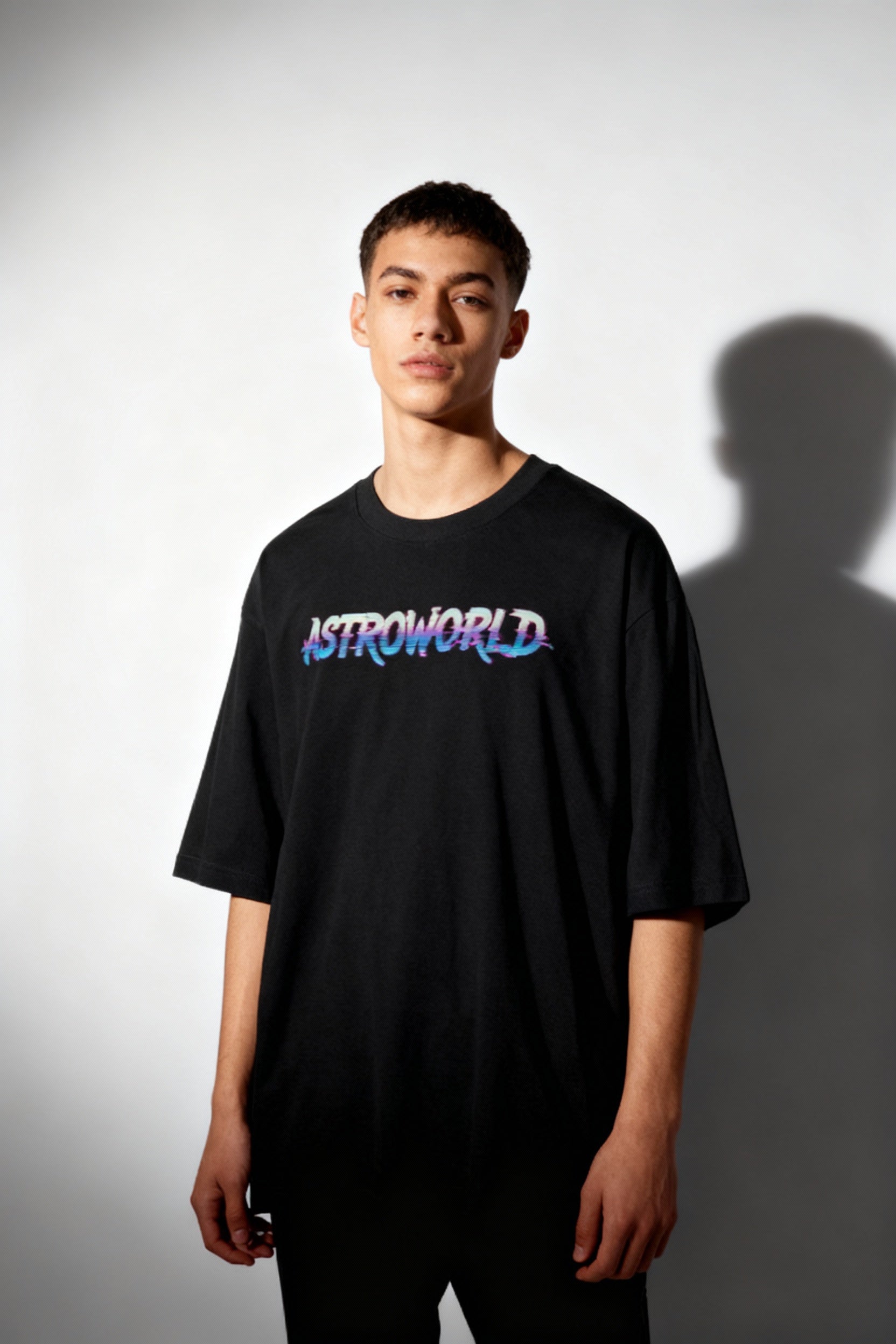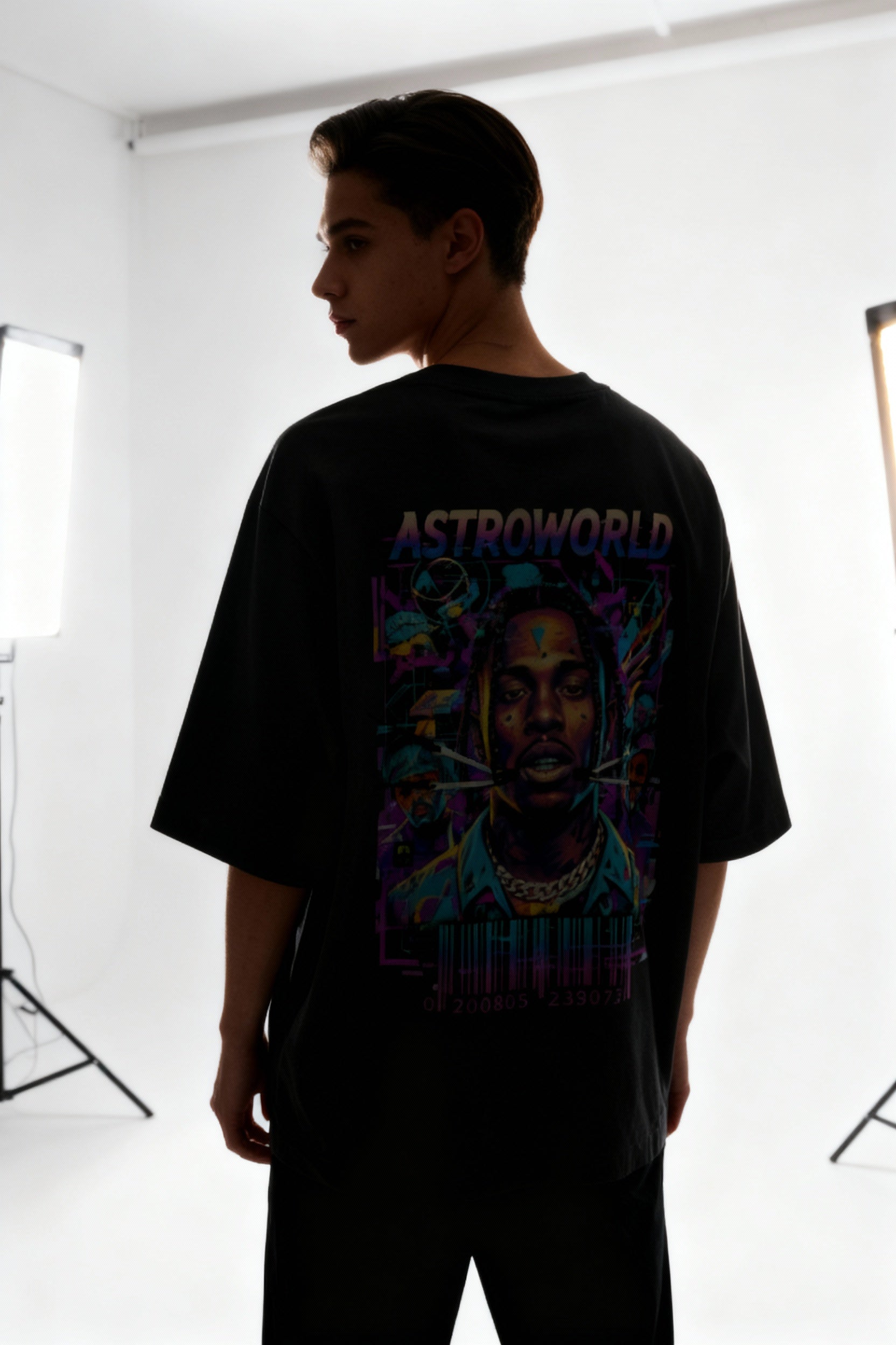 Elevate your streetwear game with the Astroworld Oversized Graphic T-Shirt , a design that fuses retro-futuristic visuals with the bold identity of hip-hop culture. The front keeps it minimal with a glitched-out ASTROWORLD text logo in shifting purple and blue tones. On the back, a full-scale neon portrait graphic bursts with detail — layered elements of futuristic city lights, barcode textures, and performance-inspired illustrations bring the festival world aesthetic to life.