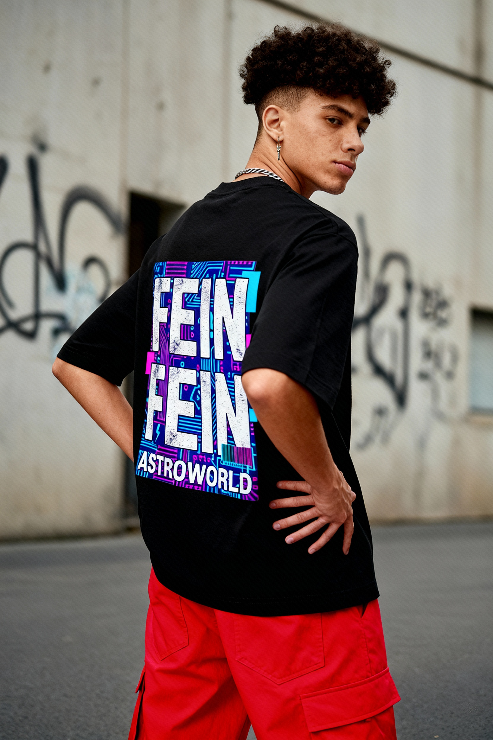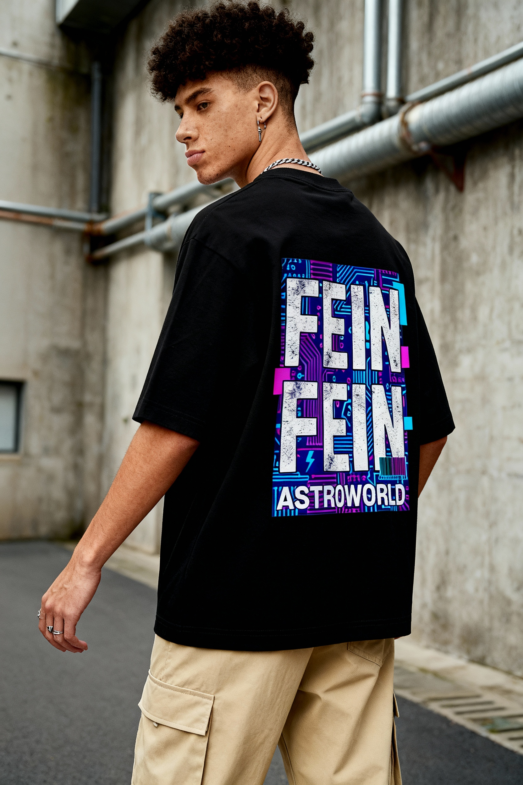 Turn up the futuristic energy with the Astroworld FE!N Graphic Tee. The design commands attention with oversized block typography repeating “FE!N”, layered over an intricate circuit board pattern in neon purple, blue, and pink. At the bottom, “ASTROWORLD” is printed in solid white, tying the graphic back to the iconic music world it represents.