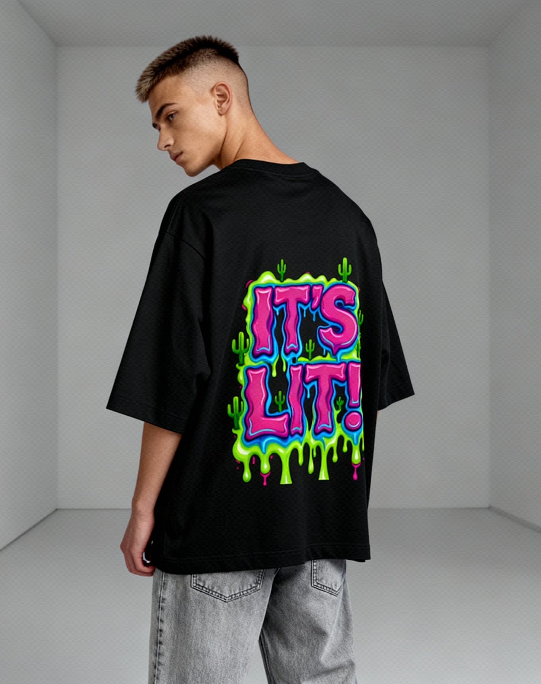 Bring pure hype to your wardrobe with the It’s Lit! Neon Drip Tee. This bold streetwear piece explodes with vibrant color and movement. The oversized “IT’S LIT!” slogan is designed in electric pink bubble lettering, outlined with glowing neon green ooze that drips down for a liquid-fire effect. Subtle green cacti details peek through the background, nodding to desert and festival culture. A perfect balance of playful design, hype energy, and bold graphic impact.