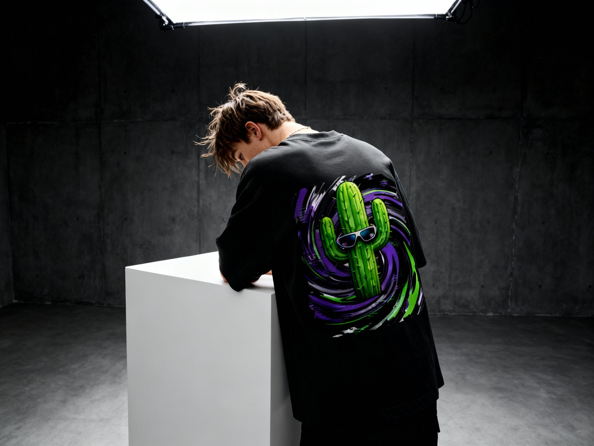 Two-Sided Print: Minimal front logo text + cactus, bold psychedelic cactus artwork on the back.