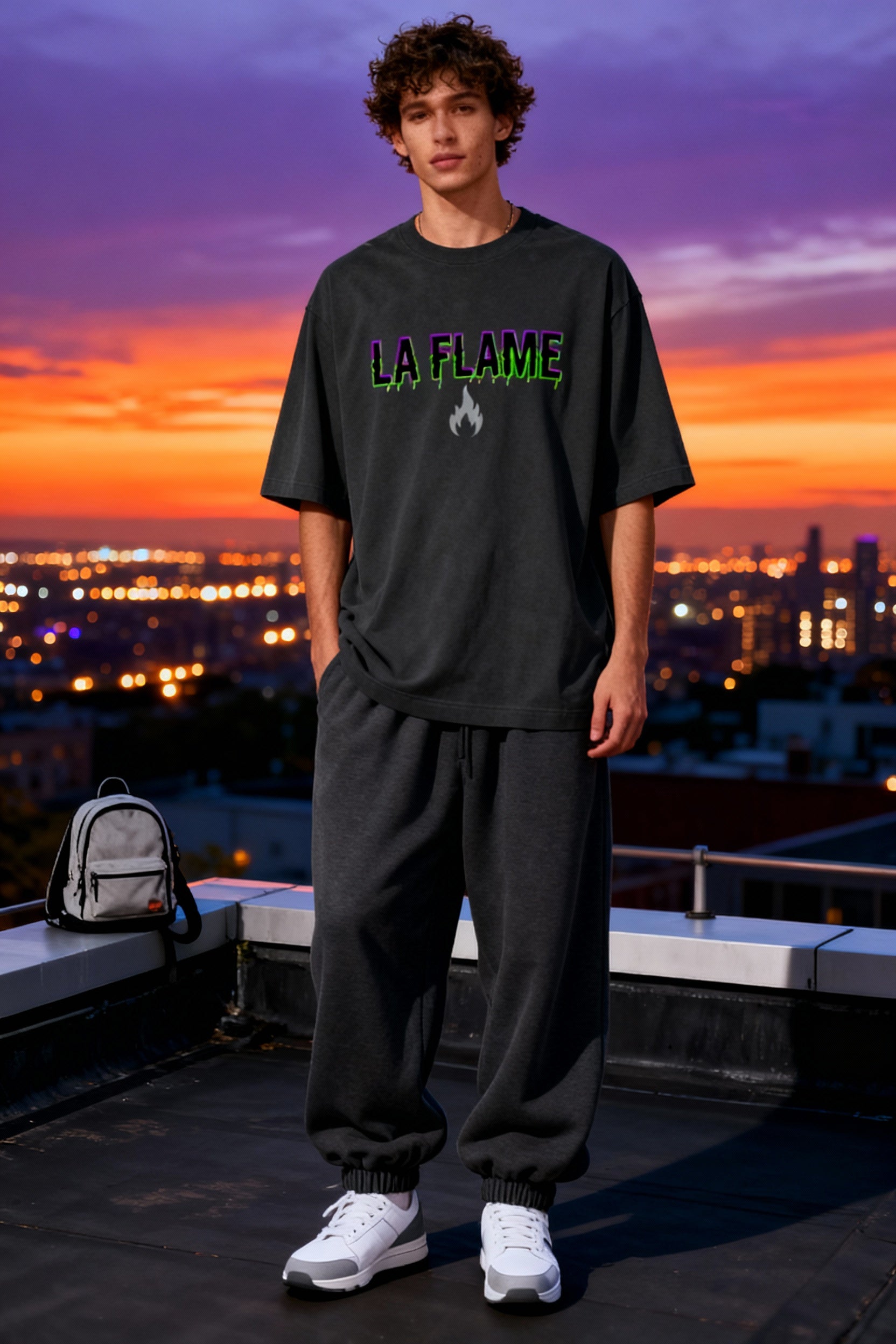 Keep the fire alive with the La Flame Neon Outline Tee, a standout piece from the streetwear-inspired collection. This design features the bold “LA FLAME” text across the chest in block-style lettering with a jagged edge finish, outlined in vivid purple and neon green for a glowing cyber effect. A minimal flame icon is placed just below the text, grounding the design with symbolic intensity.