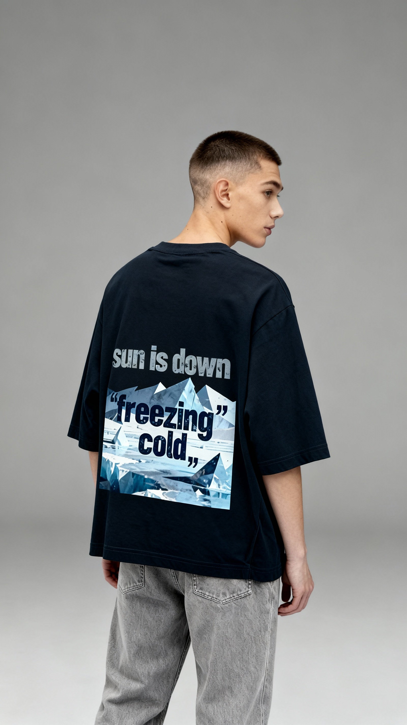 Channel the chill wave of hip-hop culture with the Sun is Down "Freezing Cold" Tee. Inspired by iconic lyrics, this tee features bold text graphics set against an icy backdrop. The phrase “sun is down” is printed in frosty grey above a block of crystalline glacier imagery, while “freezing cold” stands out in deep navy lettering, creating a striking frozen aesthetic. The design perfectly balances lyric-inspired streetwear and bold visual storytelling.